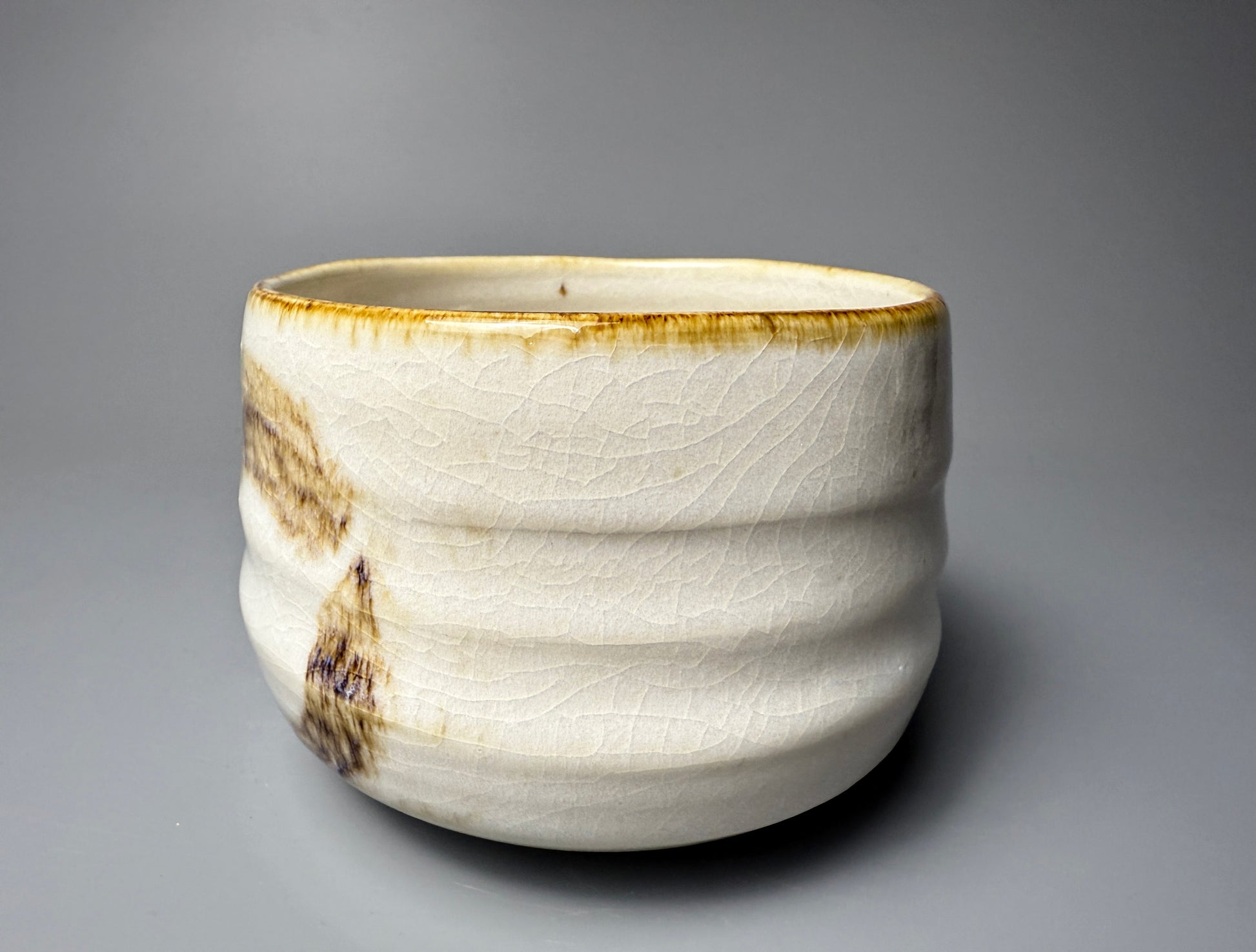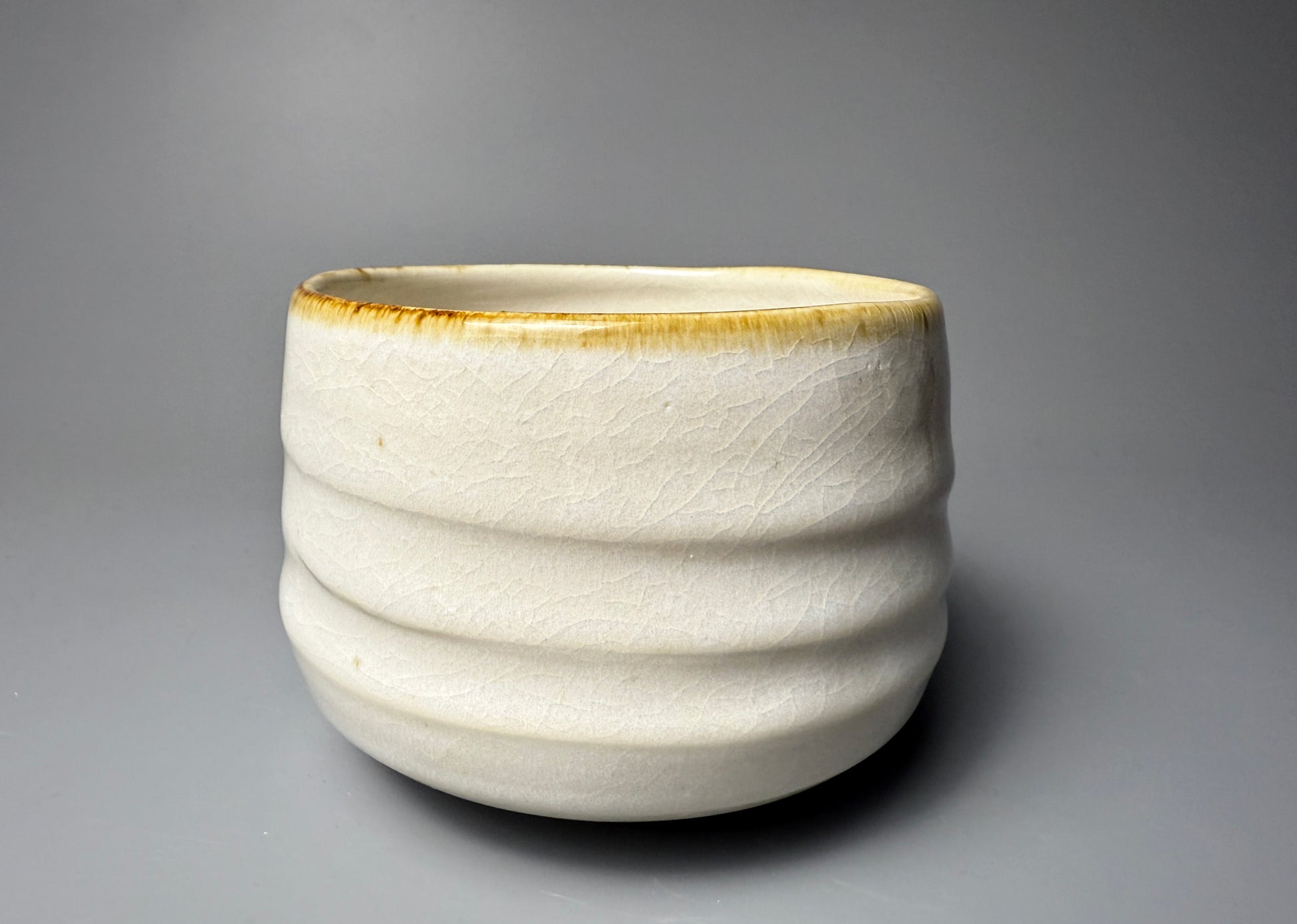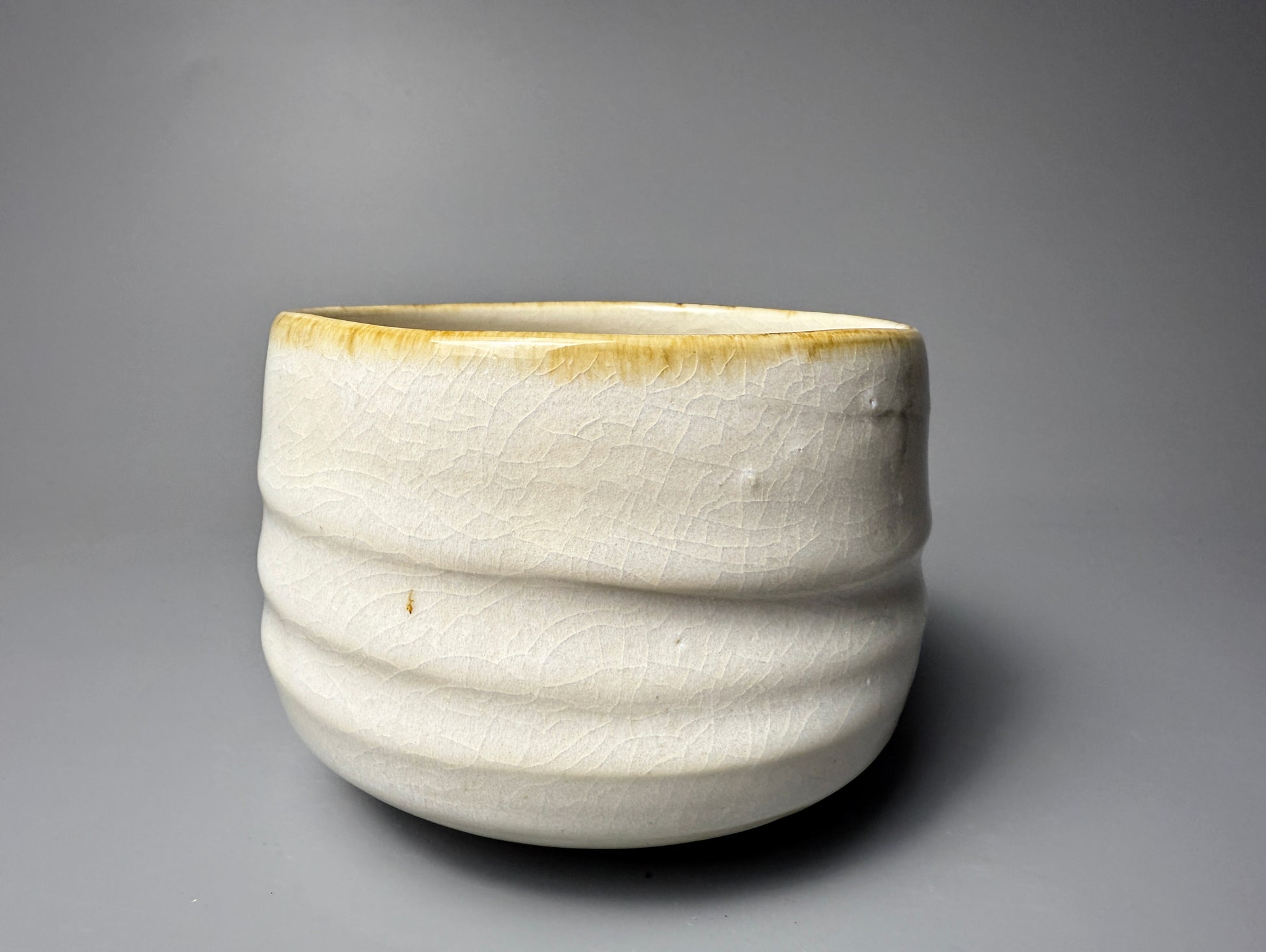 Crafted from Japanese porcelain, this chawan is finished with a soft white crackle glaze that reveals fine, delicate lines upon close look. A single brushstroke adds contrast and movement, breaking the stillness with a gesture of spontaneity. The interplay between restraint and expression reflects the spirit of wabi-sabi—finding beauty in simplicity, imperfection, and the passage of time. May this bowl bring warmth and quiet reflection to moments of tea.