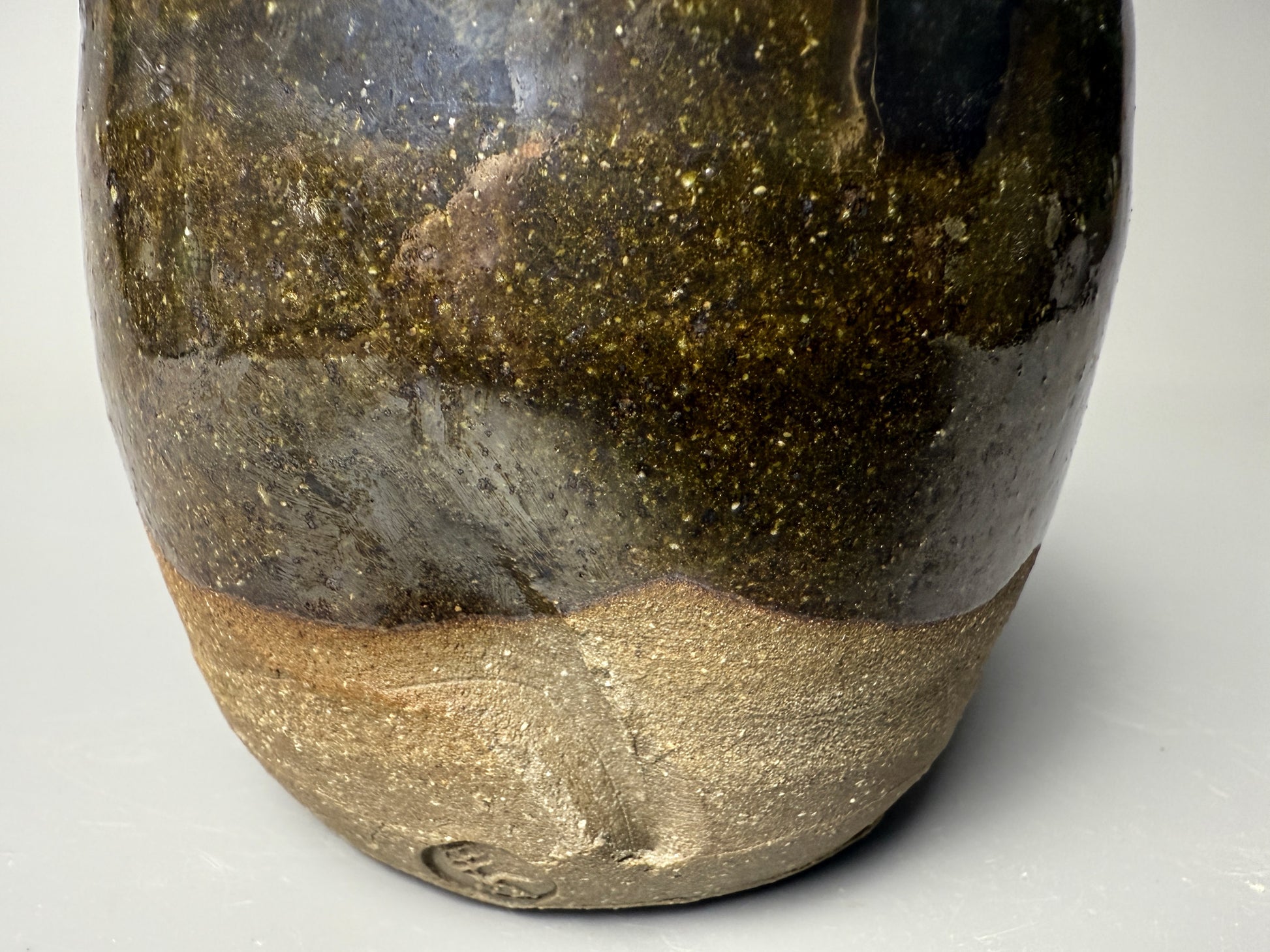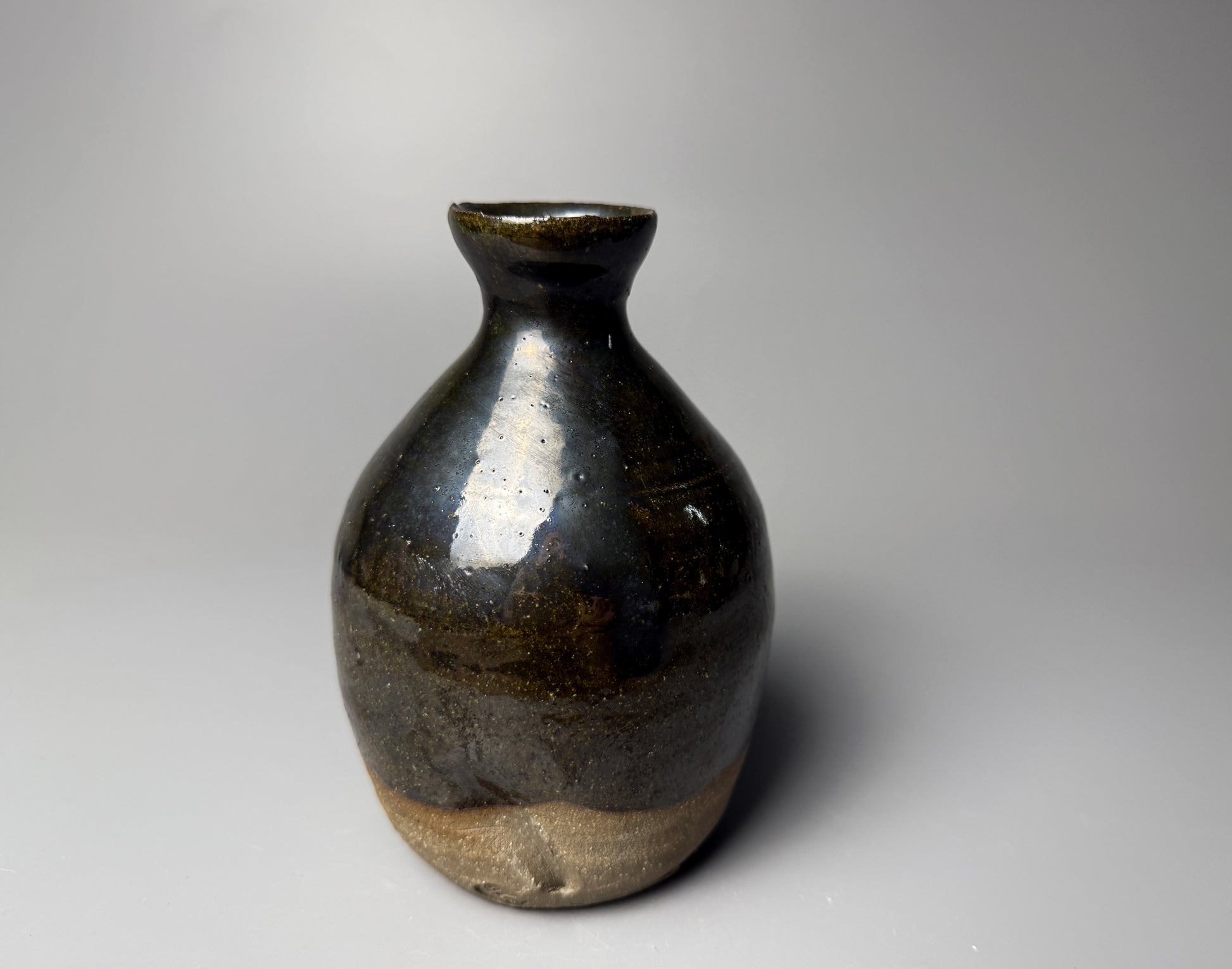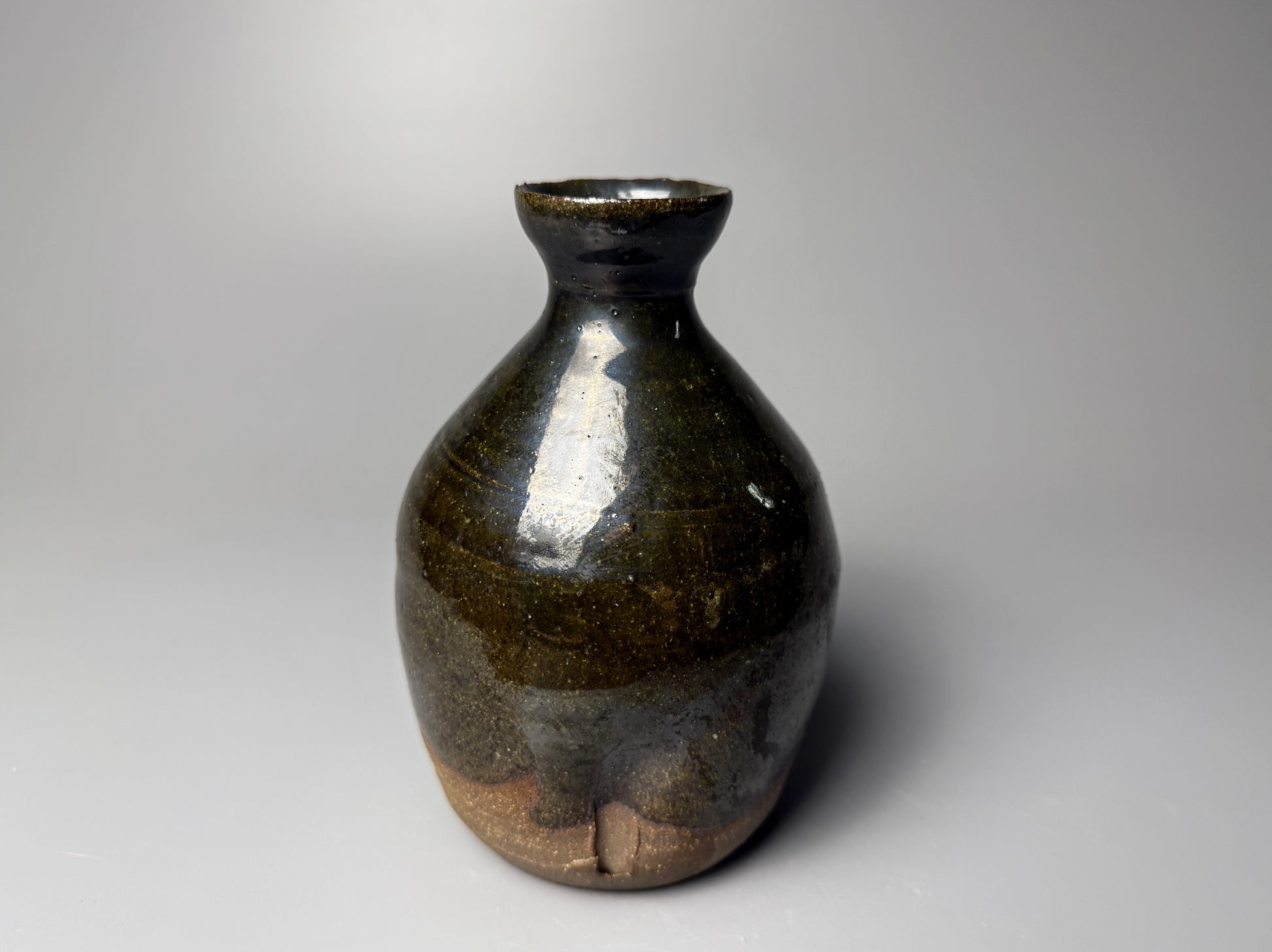 This handmade sake tokkuri is crafted from a unique blend of Japanese and Taiwanese clay. Finished with a deep, almost metallic green glaze with subtle blue undertones, each piece has its own quiet character. The base is textured using a wooden tool, adding a tactile detail that contrasts beautifully with the smooth form.