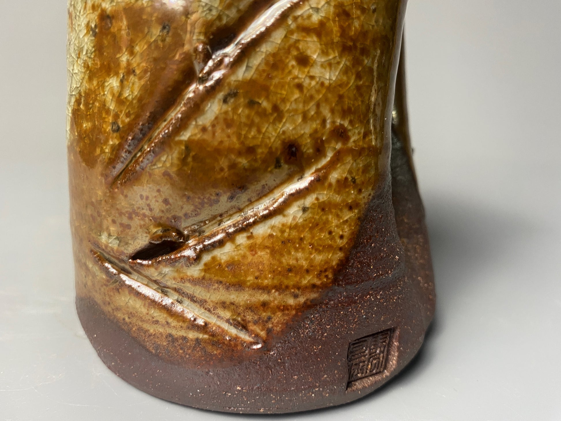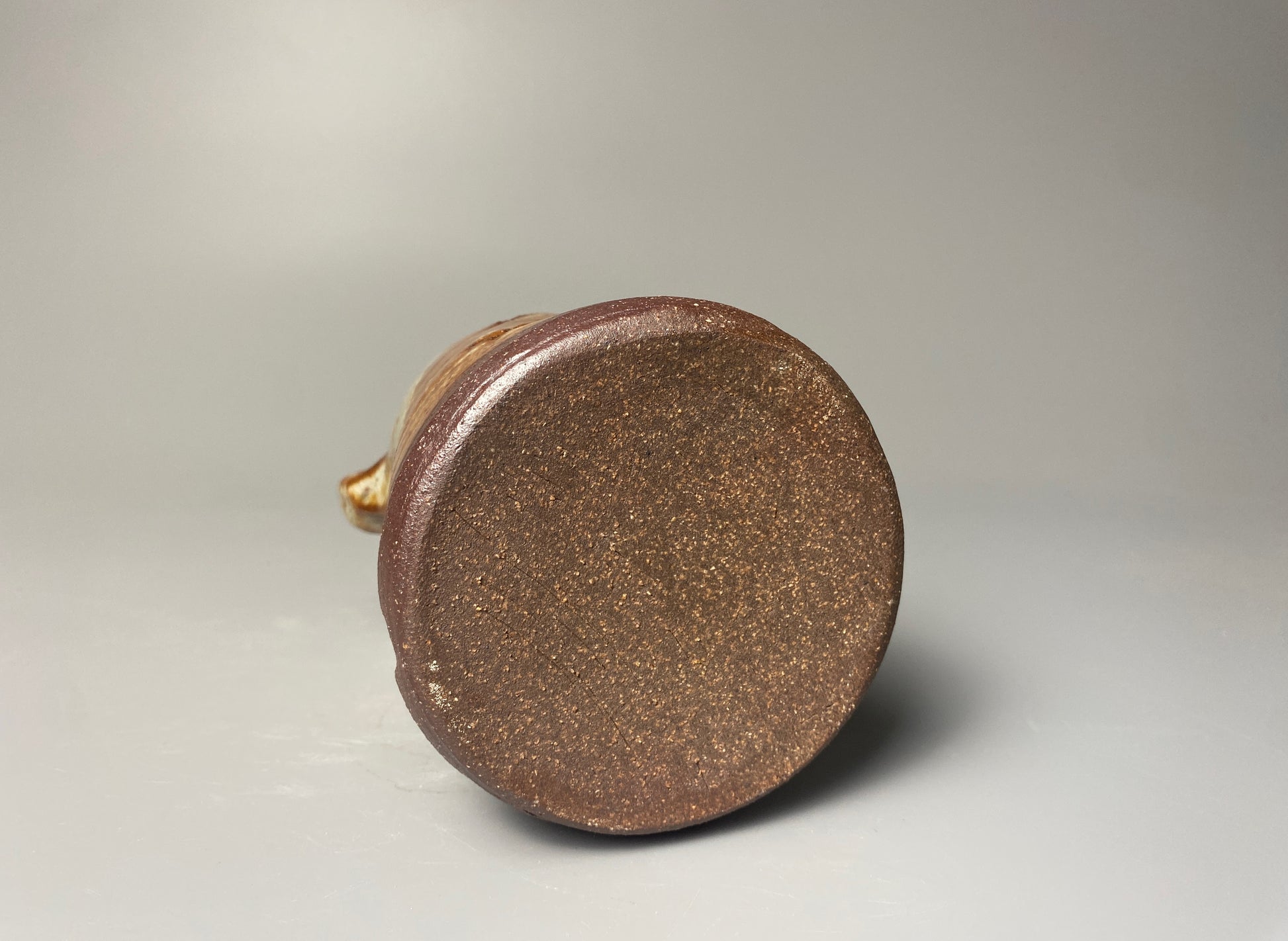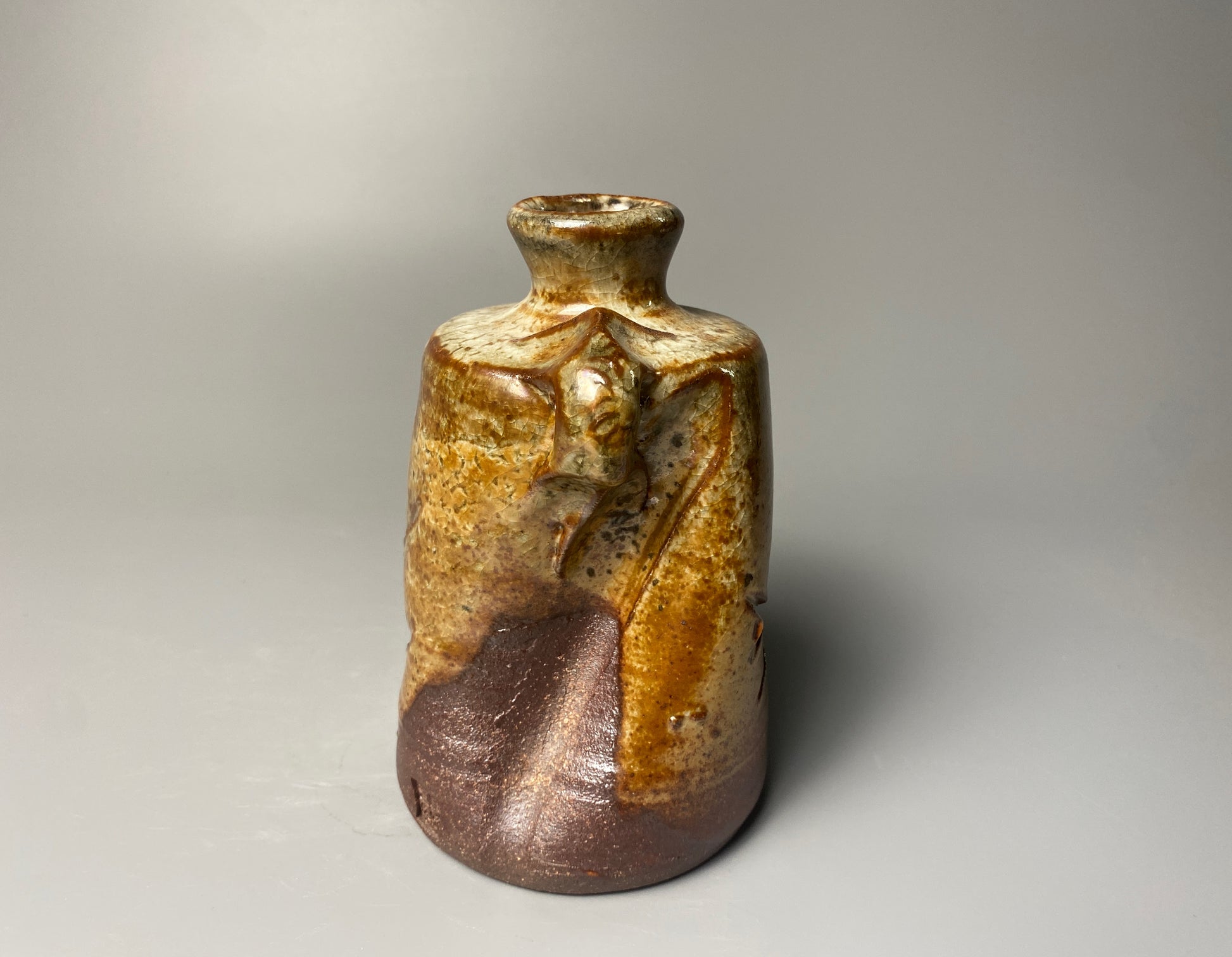 The surface is finished with a combination of natural wood ash glaze and shino glaze, creating a nice interplay of textures and tones. The shino glaze shimmers with subtle iridescence in places, catching the light in a way that adds depth and mystery to the piece.